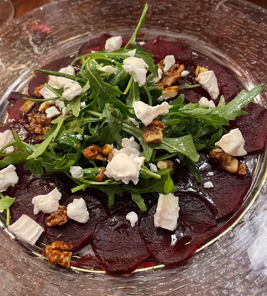 Вареную свеклу ( холодную) нарезать тонкими ломтями и выложить на дно тарелки.