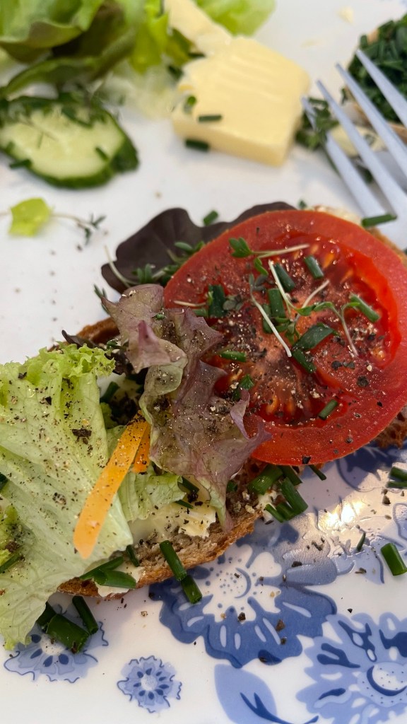 Сверху тонкий ломоть помидора, свежего огурца и салата.